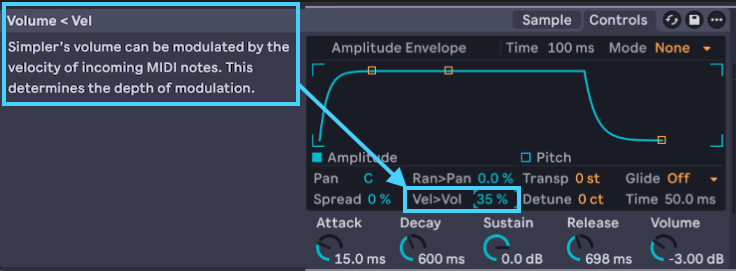 Simplerâs volume can be modulated by the velocity of incoming MIDI notes. This determines the depth of modulation.