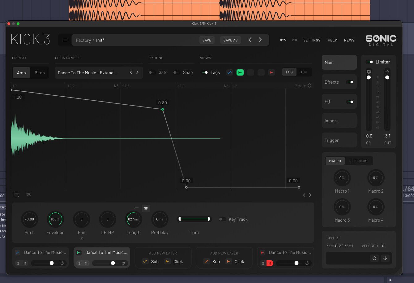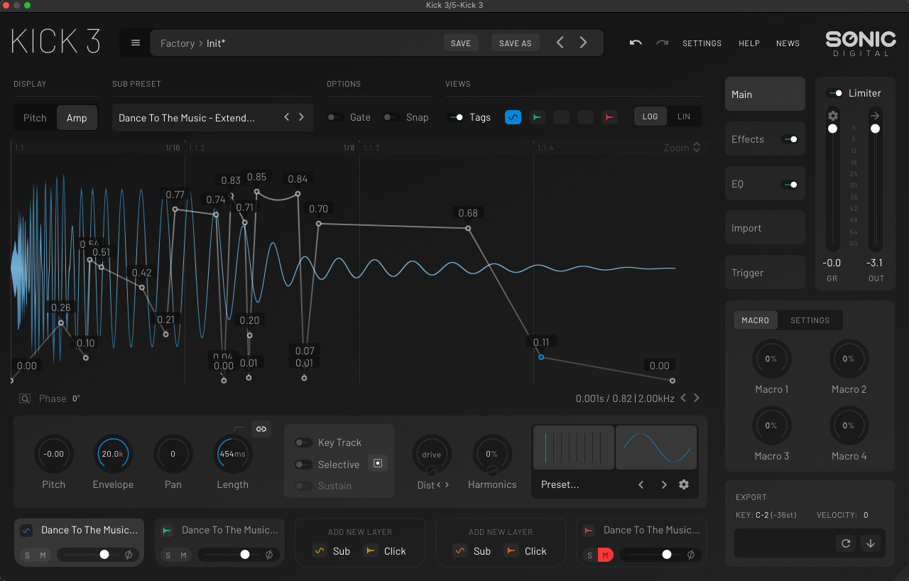 It’s possible to unlink the Length knob and set different length values for each layers ( Sub or Click ).