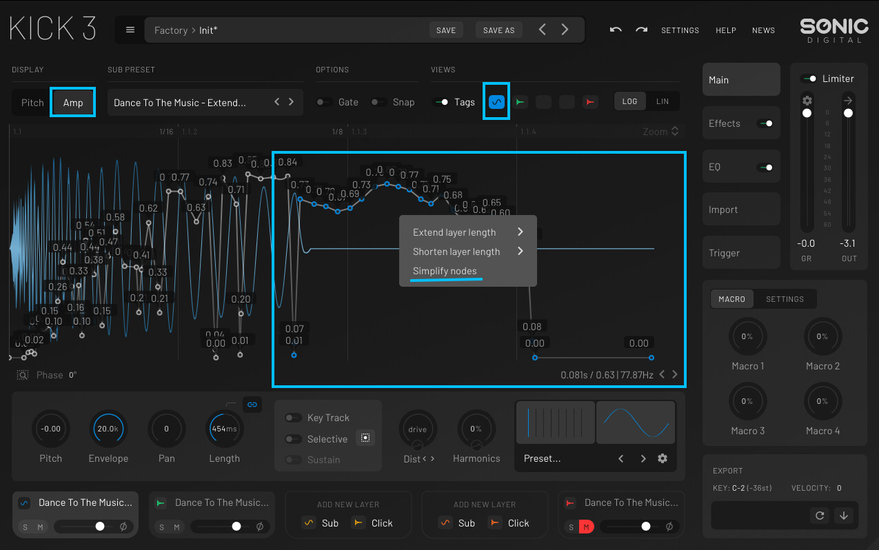 Then after analysis, isolate the Sub Layer and it’s waveform view and go to the AMP curve, select the nodes you’d like to adjust, right click on the background and you’ll get the “Simplify Nodes” tool.